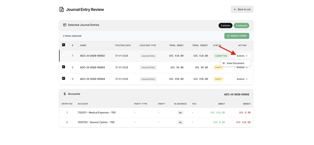 - Click "Actions" on any row and select "View Document" to open the full Journal Entry form in a new tab.