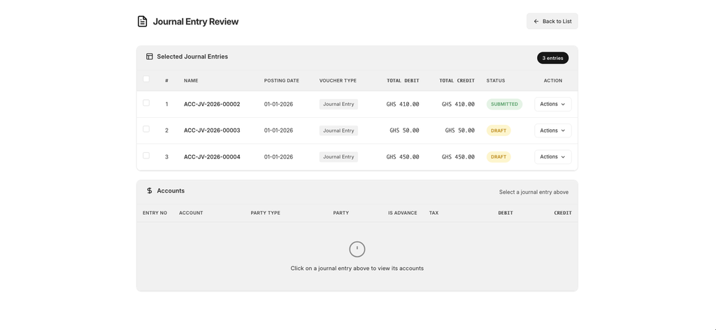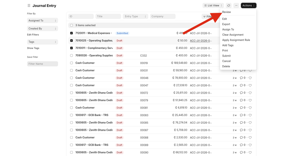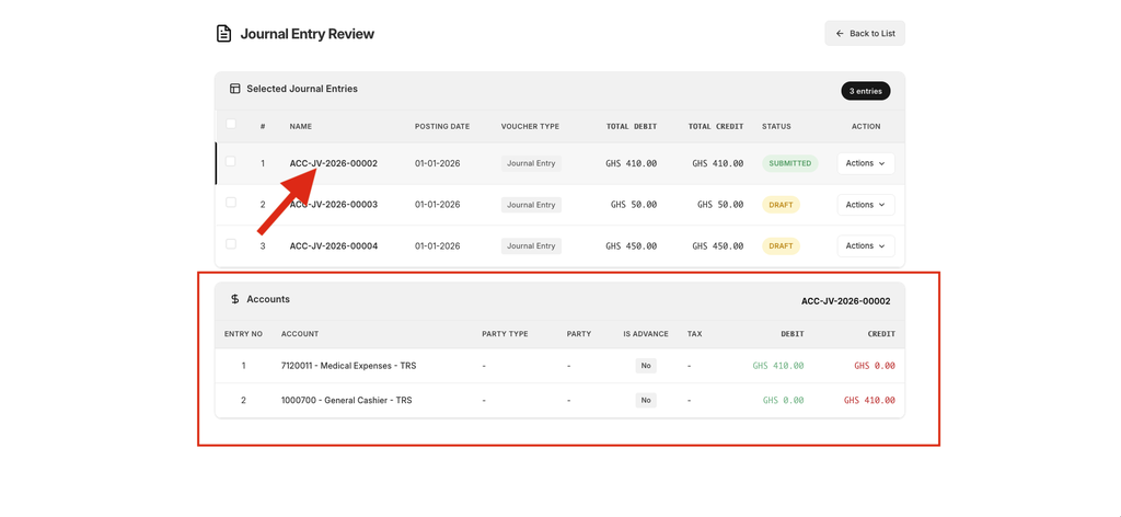- Use the checkboxes on the left to select one or more journal entries you want to review.