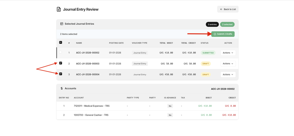 - Click it, confirm in the dialog, and all selected draft entries will be submitted.